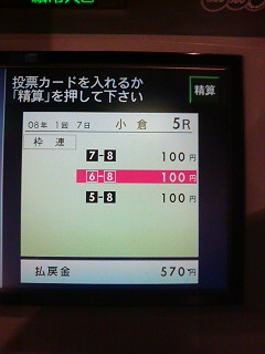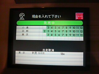 ▼そんなこんなで早速最初(第3)のレースから。雰囲気で競馬新聞を買ってみましたが、読み方がさっぱり解らないので、何となく○がたくさん付いている馬を選んで購入。買い方もさっぱり解らず、機械の裏からおばちゃんが飛んできてトギマギさせてしまいました。