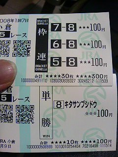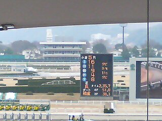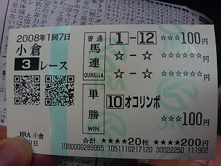 ▼さて、わたしの脳内時計では、8時半に飯塚でいTうくんを拾い、田川経由で9時半には小倉に着く計算になっておりました…が、一本道でノロノロトラックに邪魔されたり、コンビニでのいTうくんのボーンヘッド(おにぎりを食べ終わった後で、「お金払ったっけ?」の大胆発言)などで競馬場に着いたのは10時前。第1、第2レースに間に合わず、コミがやたらに不機嫌。