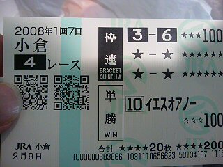 ▼気を取り直して次のレース。基本的に新聞に○がたくさん付いている馬か、気になるネーミング馬を選びます。やっぱYes-Noと言われるとクイズやらオフコースやらで黙っちゃいられませんな。